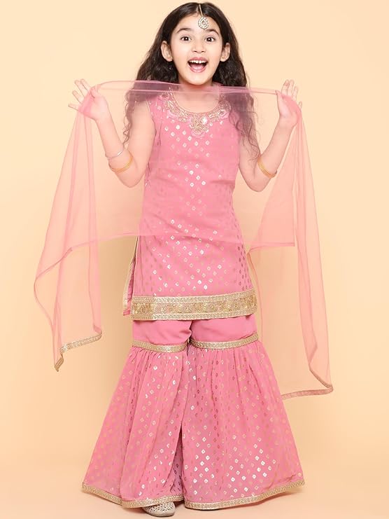 AJ DEZINES Girls Sharara Kurta Set | Georgette Sleeveless Kurti Set | Ethnic Wear for Girls | Foil Printed Sharara Suit | Stylish Kids Kurta for Festivals Weddings & Special Occasions