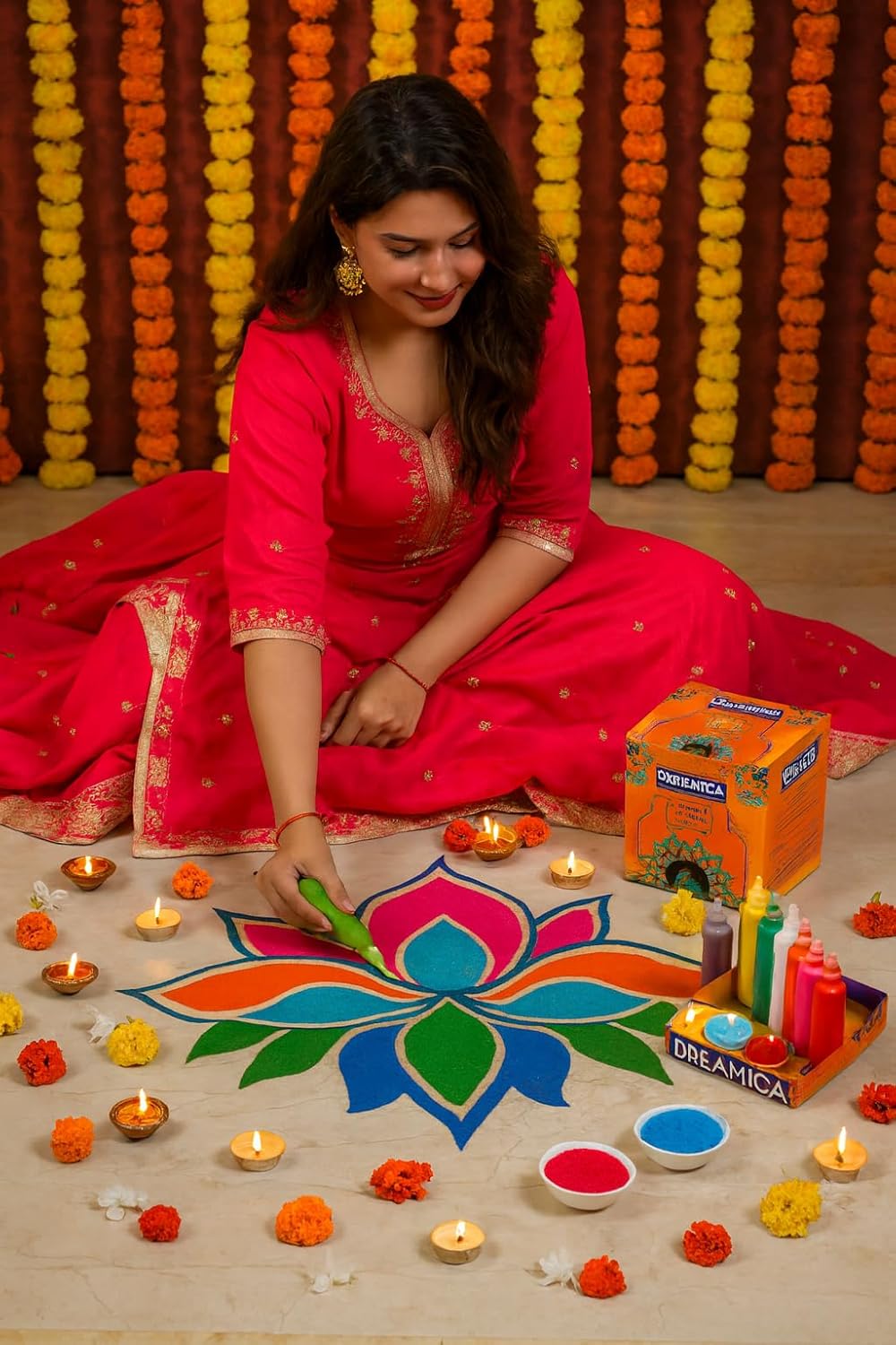 - 🎨 Kit includes 6 vibrant colors of taste-safe and toxin-free Rangoli powders.